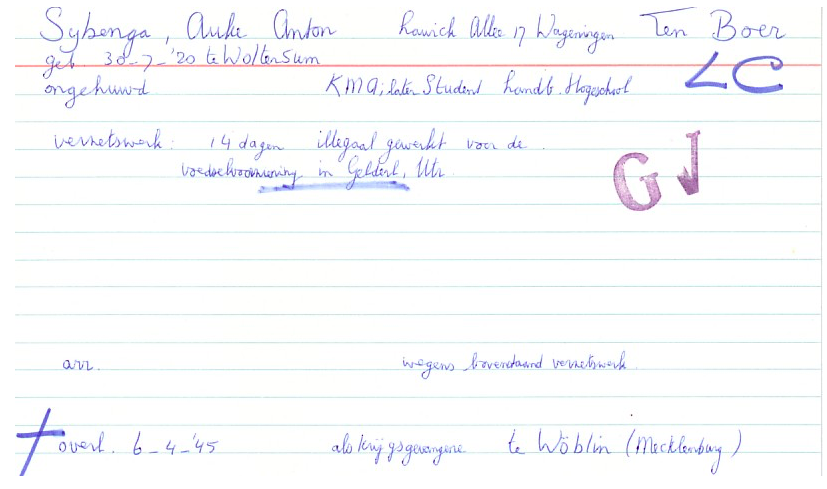 De Duitse inval in Nederland op 10 mei 1940 betekende het einde van de militaire opleiding van Auke Sybenga uit Woltersum. Auke was in 1939 geslaagd voor het toegangsexamen van de KMA in Breda, maar de bezetter beëindigde de opleiding in 1940. Auke schreef zich vervolgens in bij de Landbouwhogeschool in Wageningen, waar hij vanaf september 1940 Cultuurtechniek ging studeren. Hij woonde met een aantal andere studenten in een studentenpension aan de Lawickse Allee in Wageningen.